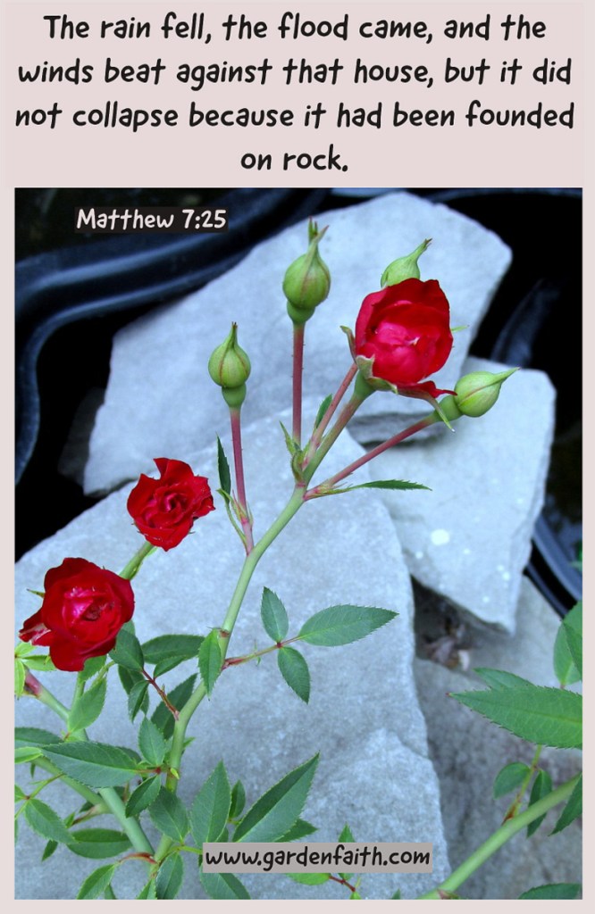 Prayer; Dear Lord, help us to grow in faith and follow Your ways. Like a house founded on rock survives the storm, a life founded on Christ can weather life’s storms. Like the rocks, shelter the red rose blossoms, let us learn to find shelter in Jesus, our rock and redeemer. Amen.