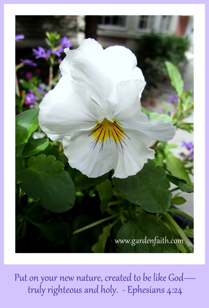 Prayer: Our Heavenly Father, help us to cast off our old ways of life and embrace a new self that is upright and holy. Let us learn from the Holy Spirit and transform our hearts and minds. Teach us to cast off our sinful ways and grow to be like Jesus. Like the glowing white pansy, let us glow with Your light and wash us white as snow into a new self. Amen