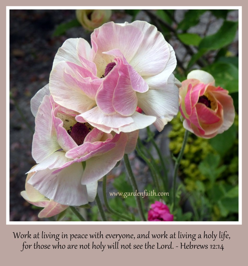 Prayer: Our Holy Father, help us to pursue peace. Guide our path helping us to get along with others and be tolerant of different points of view. Teach us to study Your Word and grow in faith. Like the Ranunculus flowers open and bloom in the spring, let us open our hearts to You and bloom with love. In Jesus’ holy name. Amen